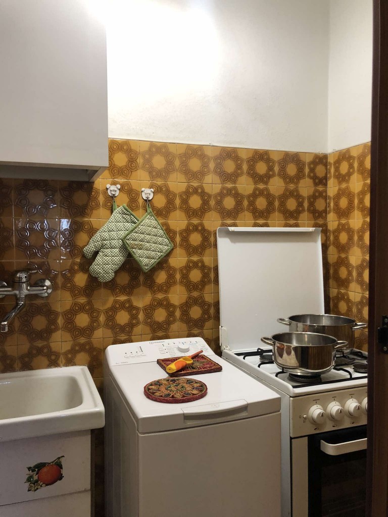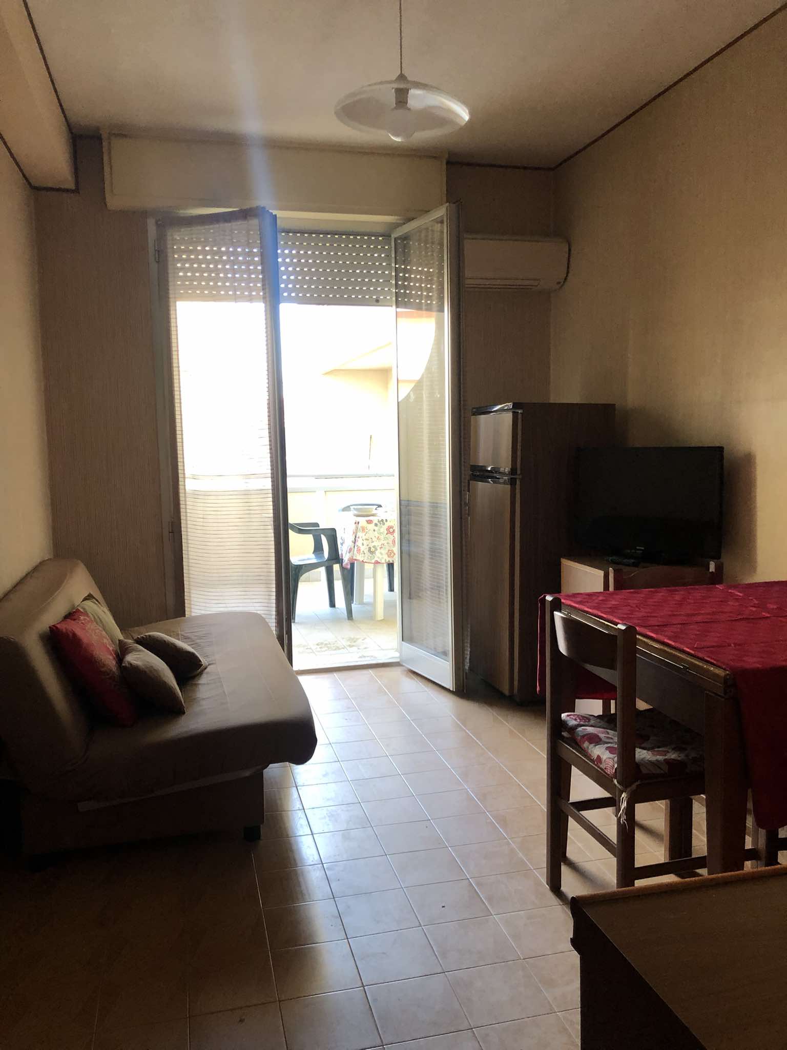 Appartamento al primo piano di un condominio con ascensore, composto da: zona giorno con divano letto, tavolo da pranzo e cucinotto. Disimpegno con accesso al bagno con doccia (senza box) e camera da letto con matrimoniale, quattro posti letto totali. Aria condizionata, TV e lavatrice. Sia dalla zona notte che dalla zona giorno si accede a due ampi terrazzi vista mare.